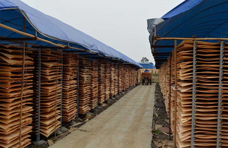 說到旋切廠,不得不提到的是怪獸木業曬板場。300畝的曬板場滿滿的都是芯板,怪獸木業的曬板場不僅曬旋切廠刨出來的板材,更多的是各個供應商提供的濕板材。每天的板材曬干收,收完再曬,重復使用無間斷。工人們每天早晚都要巡場,巡場不只為了檢查板是否曬干,更重要的是在巡查中一遍遍地挑出那些不合格的二級、三級板,保證怪獸木業模板原料的高純正性。